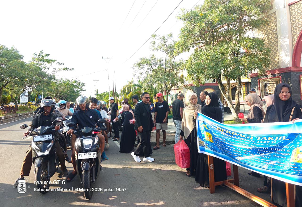 Nabire, Papua Tengah Papedanews.com Alumni Pondok Pesantren Darul Fikri bersama keluarga besar OSIS SMA Almadina Nabire menggelar kegiatan berbagi takjil kepada masyarakat di kawasan Masjid Agung Al-Falah Nabire, dalam rangka menyemarakkan bulan suci Ramadan.