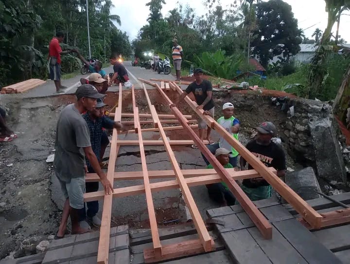 Jembatan darurat yang dibangun secara swadaya ini menjadi penopang utama mobilitas warga sejak terputusnya akses utama pascagempa.