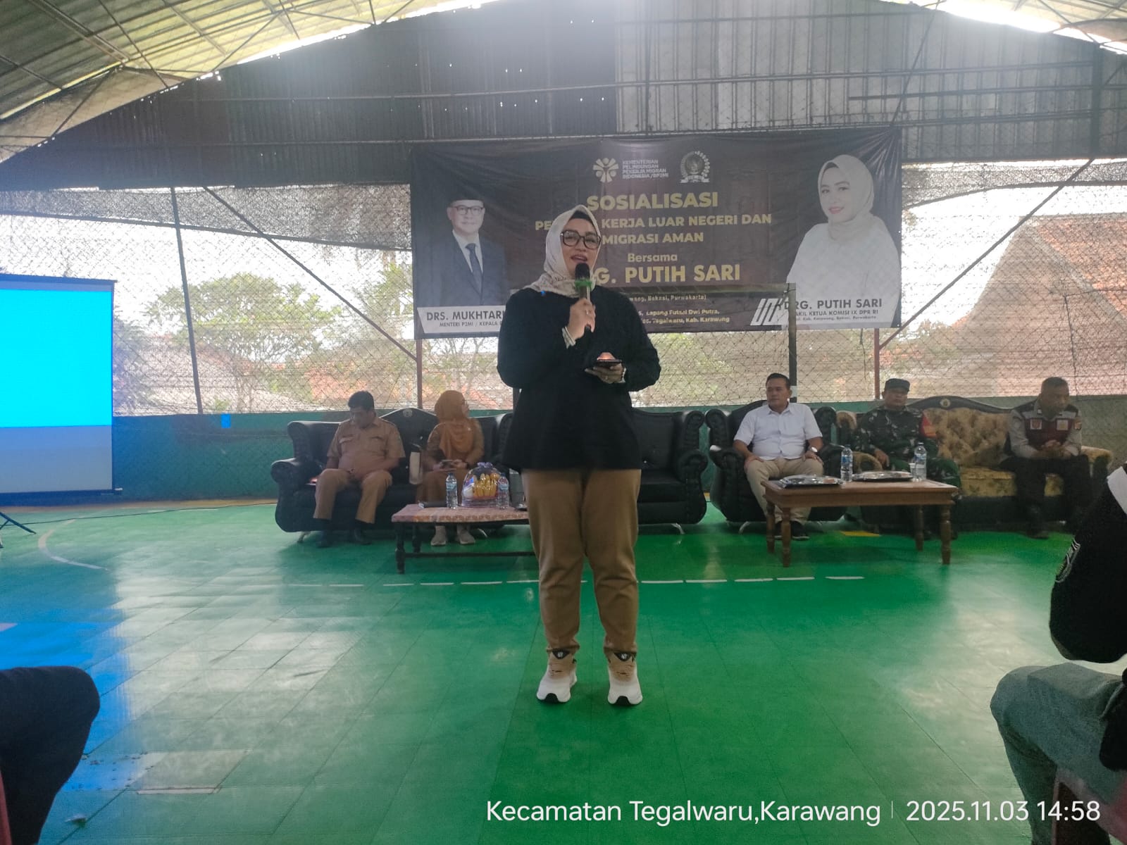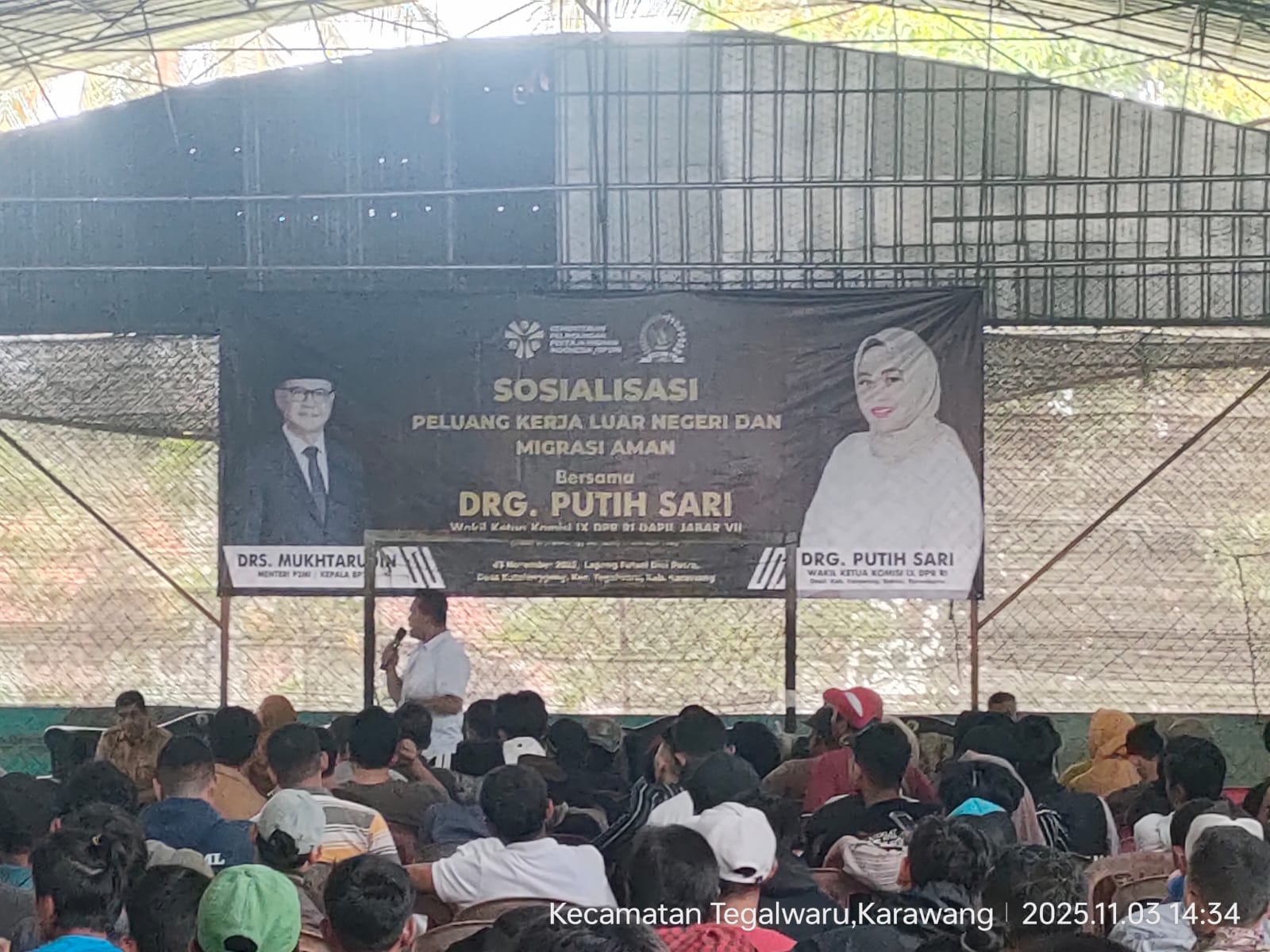 Kementerian Perlindungan Pekerja Migran Indonesia (BP2MI) bersama Wakil Ketua Komisi IX DPR RI, drg. Putih Sari, menggelar kegiatan Sosialisasi Peluang Kerja Luar Negeri dan Migrasi Aman. Acara berlangsung di Lapangan Futsal Dwi Putra, Desa Kutalanggeng, Kecamatan Tegalwaru, Kabupaten Karawang, pada Senin siang (03/11/2025).