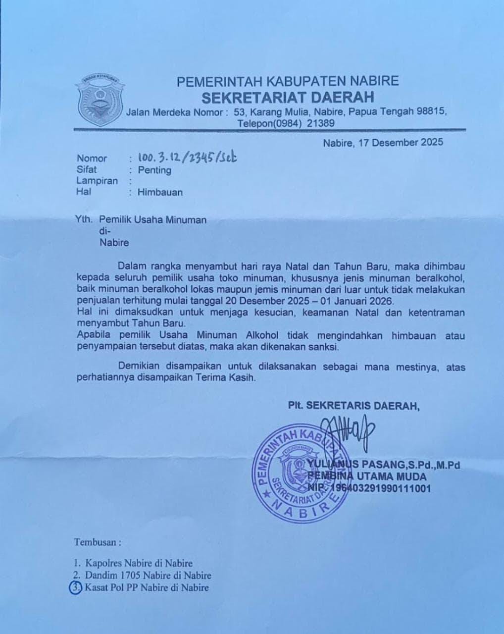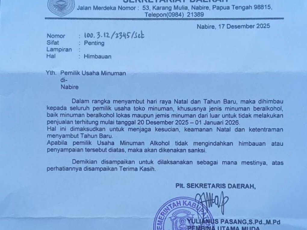 Nabire, Papua Tengah papedanews.com Pemerintah Kabupaten Nabire resmi menerbitkan himbauan larangan penjualan minuman keras (miras) serta pembatasan operasional seluruh kafe di wilayah Kabupaten Nabire, terhitung mulai 20 Desember hingga 1 Januari mendatang. Kebijakan ini dikeluarkan dalam rangka menjaga ketertiban, keamanan, dan kenyamanan masyarakat menjelang perayaan Hari Raya Natal dan Tahun Baru.