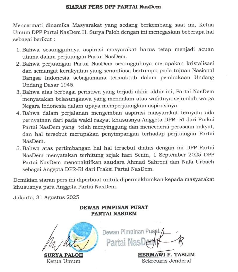 “Bahwa atas pertimbangan hal hal tersebut diatas dengan ini DPP Partai NasDem menyatakan terhitung sejak hari Senin, 1 September 2025 DPP Partai NasDem menonaktifkan saudara Ahmad Sahroni dan Nafa Urbach sebagai Anggota DPR-RI dari Fraksi Partai NasDem,”