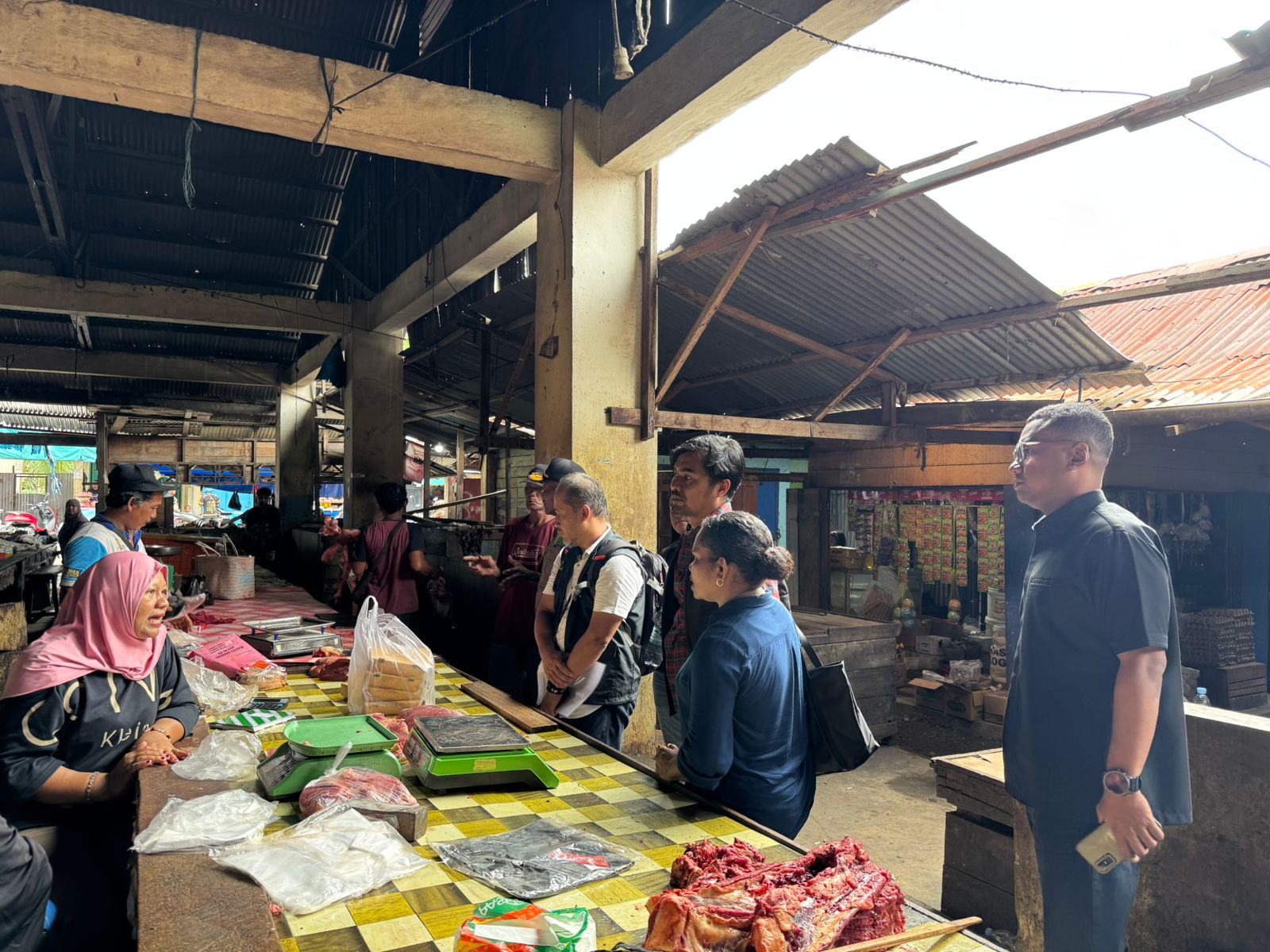 Selanjutnya, tim melakukan pengecekan berbagai komoditas pangan strategis seperti beras, Minyak Kita, daging sapi, serta sejumlah bahan pangan rempah yang dijual oleh para pedagang di dalam Pasar Sentral Kalibobo.